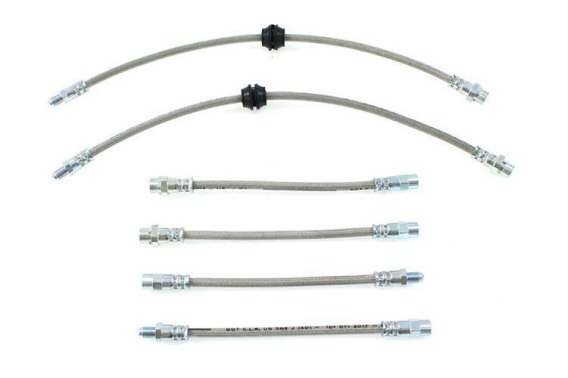 Komplet teflonowych przewodów hamulcowych w stalowym oplocie.